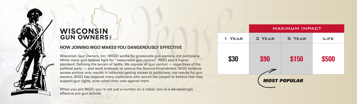 Wisconsin Gun Owners, Inc. is a 501(c)4 non-profit organization. Donations made to Wisconsin Gun Owners, Inc. are not deductible for income tax purposes. Thank you!